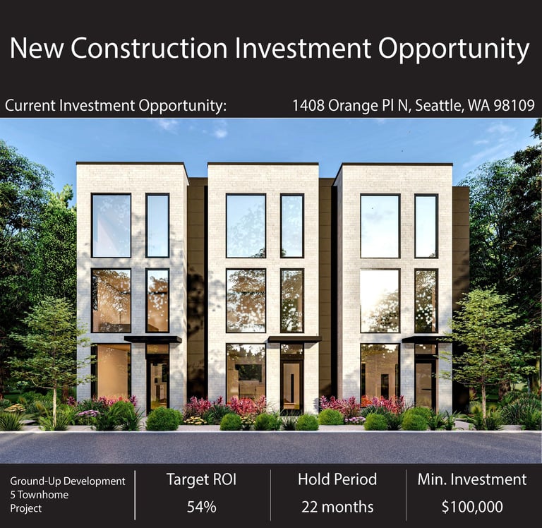 This webpage is not an offer to sell securities or solicitation of an offer to purchase. Purchase and sale of securities will be conducted solely in compliance with Regulation D Rule 506(c) as promulgated by the Securities & Exchange Commission. The Company presents investors and potential investors with documents containing forward-looking statements within the meaning of the federal securities laws. These forward-looking statements are not historical facts, but rather are based on our current expectations, estimates, and projections about us, the proposed location of the development, and the market for townhomes. You can identify these forward-looking statements when you see us using words such as “expect,” “anticipate,” “estimate,” “plan,” “believe,” “seek,” and other similar expressions that are intended to identify forward-looking statements. Although we believe that the expectations reflected in these forward-looking statements are reasonable, these statements are not guarantees of future performance and are subject to certain risks, uncertainties, and other factors, some of which are beyond our control, are difficult to predict, and could cause actual results to differ materially from those expressed or forecasted. All statements other than statements of historical facts included in the Company’s documents including, without limitation, any projections and assumptions such as “Completion Value”, “IRR”, or “Rents” are forward-looking statements. These risks and uncertainties include those described in “Risk Factors” in the Company’s Private Placement Memorandum. You should not place undue reliance on these forward-looking statements, which reflect our management’s view as of certain dates. We undertake no obligation to update these statements or to report the result of any revision to the forward-looking statements that we may make to reflect events or circumstances after the commencement date of this offering or to reflect the occurrence of unanticipated events. All subsequent written and oral forward-looking statements attributable to us, or persons acting on our behalf are expressly qualified in their entirety by these cautionary statements.